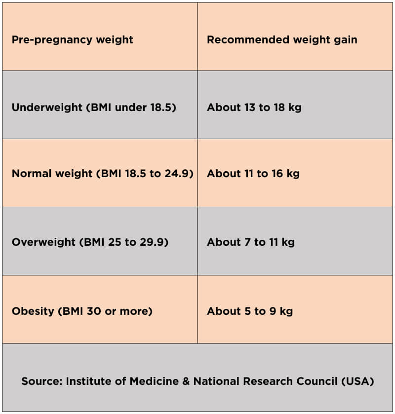Optimal weight gain is necessary during pregnancy for a healthy outcome. It is advised to consume well balanced meals that contain adequate protein. For a healthy baby, it is advised to gain 5-18Kgs of weight over the course of pregnancy. The doctor or dietitian will help in determining the amount of weight gain that is appropriate for an individual. The table below provides an estimate of how much weight gain can be planned considering the current weight of the individual.