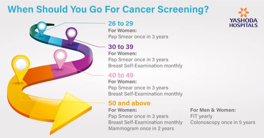 The process of identifying cancer before a person develops any symptoms is called cancer screening. Early detection of cancer or any abnormal tissue can help in early treatment before cancer may grow and spread. However, one must remember that merely getting a screening test doesn’t always mean that a person is suspected to have cancer. Cancer screening gives a heads-up to receive best-in-class care in preventing and treating cancer.