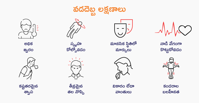 వడదెబ్బ సంభవించినప్పుడు శరీరం తీవ్రమైన సంకేతాలను చూపిస్తుంది. వాటిలో సాధారణంగా కనిపించే కొన్ని ముఖ్యమైన లక్షణాలు ఈ క్రింద వివరించబడ్డాయి: