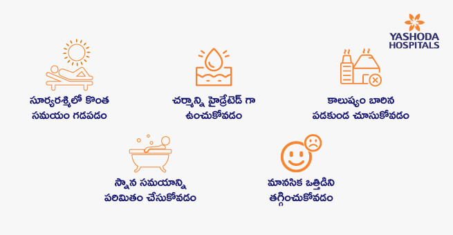 రోజూ సూర్యరశ్మిలో కొంత సమయం గడపడం వల్ల చర్మం ఆరోగ్యంగా ఉండి పొలుసులు రాకుండా ఉంటుంది. అయితే ఎక్కువ ఎండలో ఉండేవారు మాత్రం తప్పకుండా శరీరాన్ని కప్పి ఉంచే పొడవాటి దుస్తులు మరియు నెత్తిపైన పెద్ద టోపి వంటి వాటిని వాడాలి.