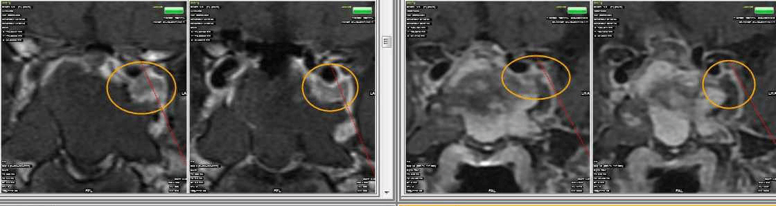 65 year old male with Pituitary Macroadenoma with cavernous sinus extension. Endoscopic Transsphenoidal Surgery done with Intraoperative MRI showing residual tumor in the cavernous sinus region under the left carotid artery. Post op MRI showing on the right no residual tumor in the sinus. (T1 contrast above and T2 coronal sections below).