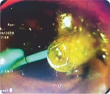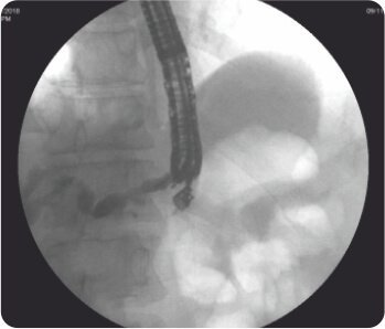 EUS guided puncture of IHBRD in the second segment of liver was done from stomach and after the cholangiogram, the tract was dilated sequentially using cystotomes till 10F and a 60×10 mm fully covered biliary metal stent was deployed connecting the stomach and the second segment of liver. A 7F 7cm double pigtail plastic stent was deployed within the metal stent to prevent its displacement. There were no periprocedural complications and the patient underwent chemotherapy after normalization of bilirubin. During follow-up 3 months after the procedure, the patient’s LFT remained normal.
