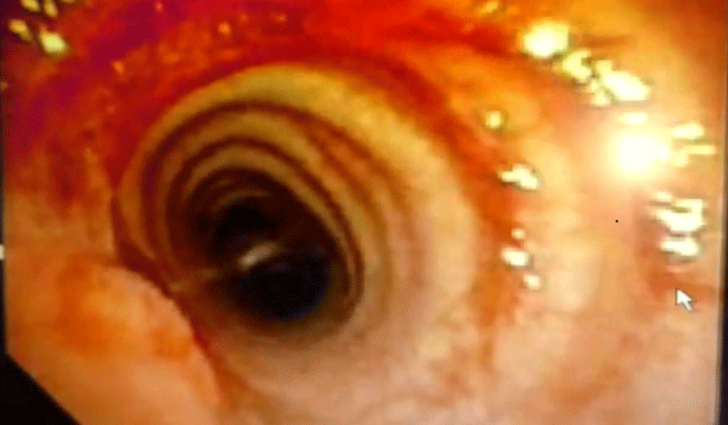 A 6-year-old female child presented to our clinic with progressive breathlessness and stridor for a duration of 5 days. She had a recent history of road traffic accident and sustained head injury and underwent craniotomy for extradural hemorrhage. Post-surgery she was on mechanical ventilator support for 10 days after which she was extubated. She developed stridor after 7 days of extubation. CT Neck revealed focal hour-glass configuration, concentric asymmetrical subglottic narrowing with associated soft tissue thickening 2-3cm below the level of vocal cords, with a diameter of 4.5 x 5.0 mm (AP X TR) at the point of maximal narrowing. Diagnostic flexible bronchoscopy showed circumferential stenosis (Grade III Myers-Cotton) of subglottic area about 2.5 cms below the glottis and we could not negotiate beyond the level of stenosis.
