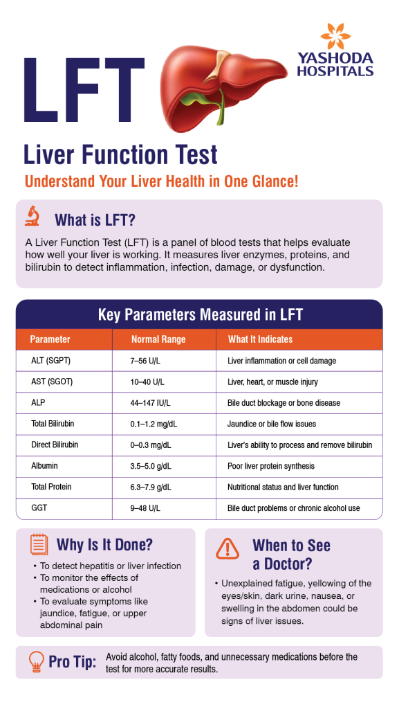 LFT is also known as the liver panel test, liver profile test, and hepatic function panel. During LFT, the following substances are measured; total protein, albumin, bilirubin, alanine transaminase, aspartate aminotransferase, alkaline phosphatase, lactate dehydrogenase, and prothrombin time. Abnormal values in the liver function test may indicate the presence of liver disease, but it may not always be the case. Thus, always contact your healthcare provider while interpreting the LFT results.