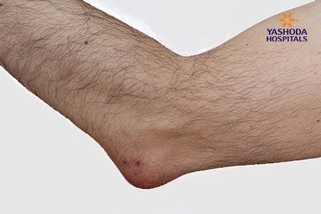 Olecranon bursitis is a condition defined by swelling, redness, and pain at the tip of the elbow. It occurs in the olecranon bursa, a thin, fluid-filled sac that is found in the boney tip of the elbow.