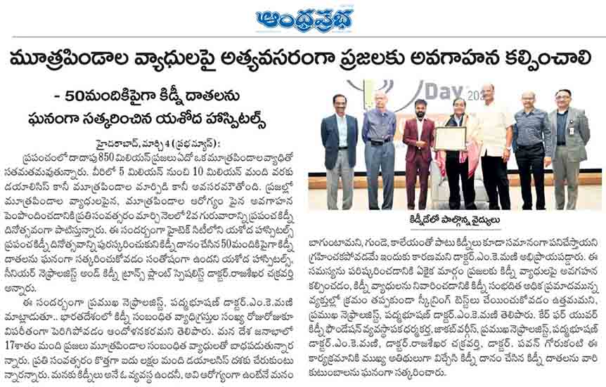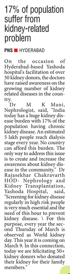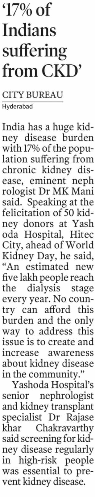 Eminent nephrologist Padmabushan Dr. M.K.Mani presided over the meeting. Dr. Jacob Verghese, Founder trustee, Care for your kidney foundation, delivered the Dr. M.K.Mani oration along with Director of Yashoda Hospitals, Dr. Pavan Gorukanti and consultant nephrologist and clinical director and HOD of nephrology and transplant specialist, Dr. Rajasekhar Chakravarthy and many Nephrologists and other doctors today.