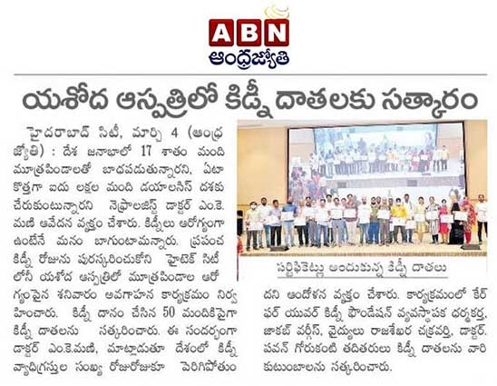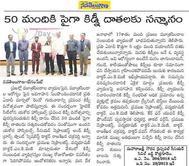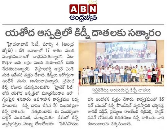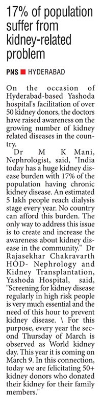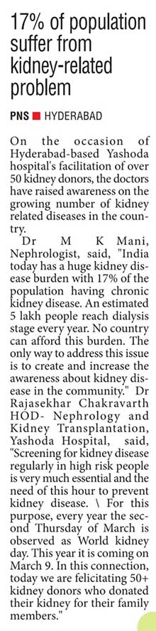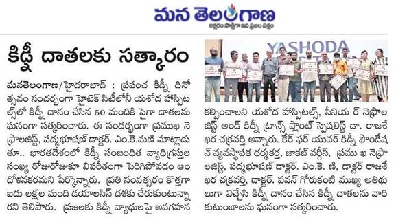 Speaking on the occasion, Dr. Rajasekhar Chakravarthy, consultant nephrologist and clinical director and HOD of nephrology and transplant specialist, said, “Screening for kidney disease regularly in high risk people is very much essential and is the need of the hour. For this purpose, every year the second Thursday of March is observed as World Kidney Day. This year, it is coming on March 9. In this connection, in Yashoda hospitals, Hitec City, today we are felicitating 50+ kidney donors who donated their kidney for their family members.” People suffering from diabetes and hypertension must be very careful about kidney diseases, and in particular health screening for all is must.