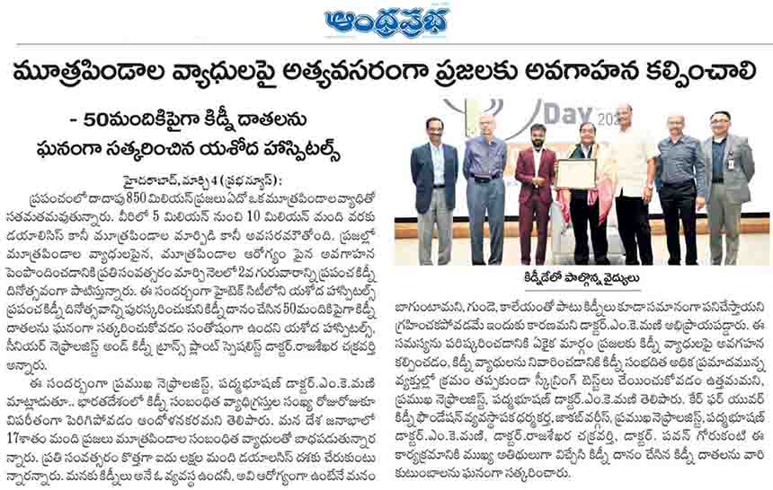 Hyderabad, March 4, 2023: “India today has a huge kidney disease burden, with 17% of the population having chronic kidney disease. An estimated five lakh people reach the dialysis stage every year. No country can afford this burden. The only way to address this issue is to create and increase awareness about kidney disease in the community,” said eminent nephrologist in our country Padmabhushan Dr. M. K. Mani on the occasion of Yashoda Hospital’s facilitation of 50+ kidney donors at Yashoda Hospitals, Hitec City, on the occasion of World Kidney Day coming on March 9, 2023.