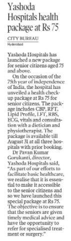 Hyderabad, 17th August 2021: On the occasion of the 75th year of Independence, Hyderabad based Yashoda Hospitals launched a Health Check Package at Rs 75 for all senior citizens aged 75 and above. The package includes CBP, RFT, Lipid Profile, LFT, RBS, ECG, Vitals, consultation with a Dietician & Physiotherapist amongst the aged population. The package has been made available from 15th August till 31st August 2021. The packages can be availed at all three units of Yashoda Hospitals (Somajigida, Secunderabad and Malakpet) with prior booking.