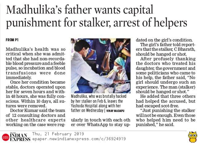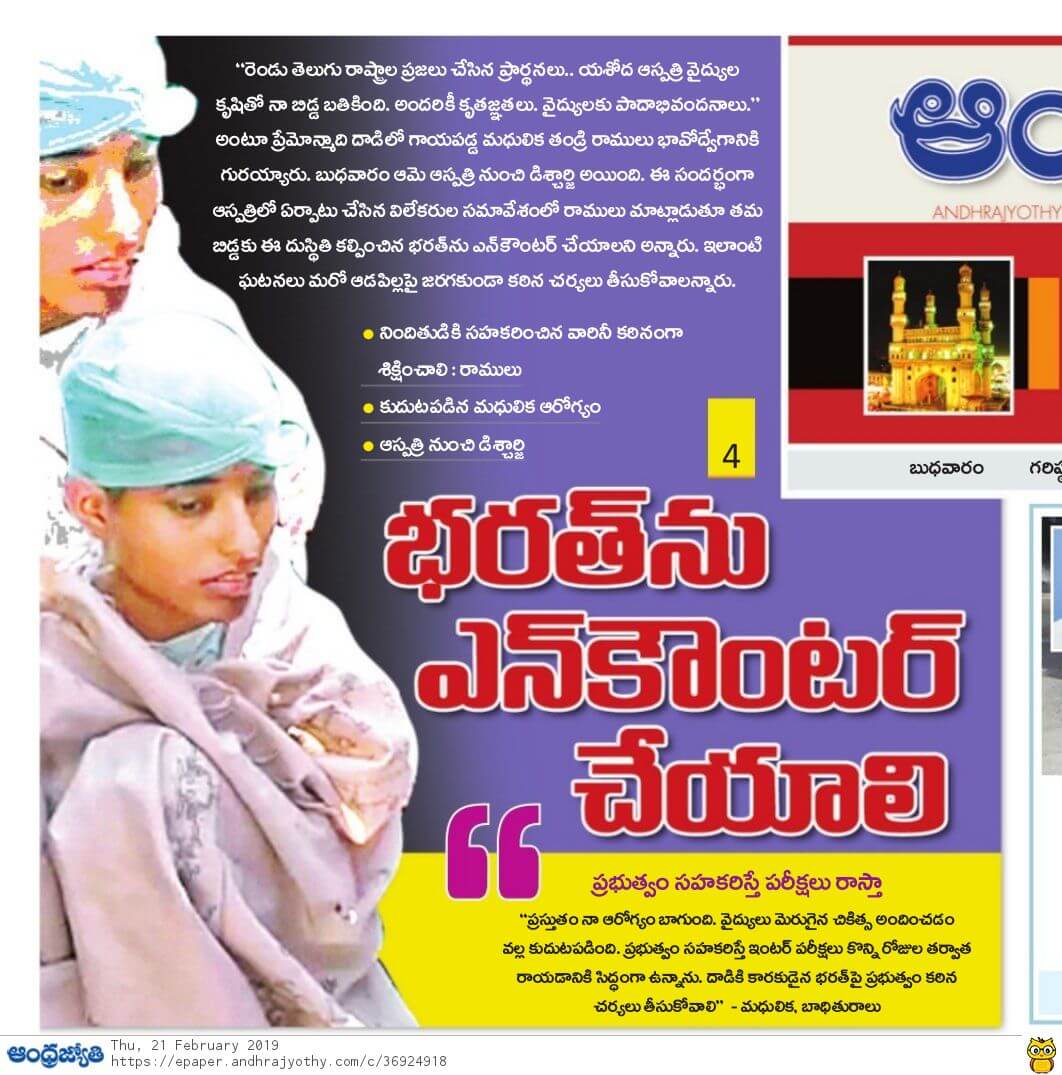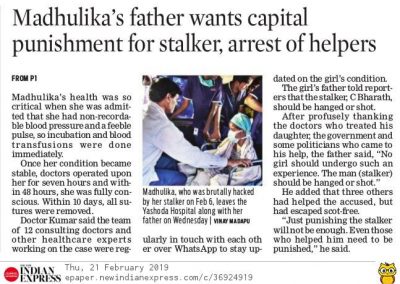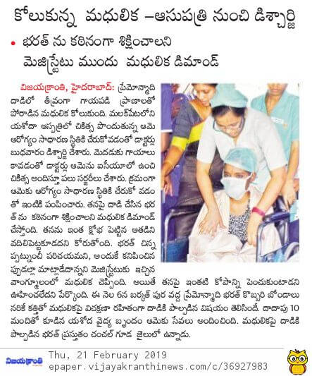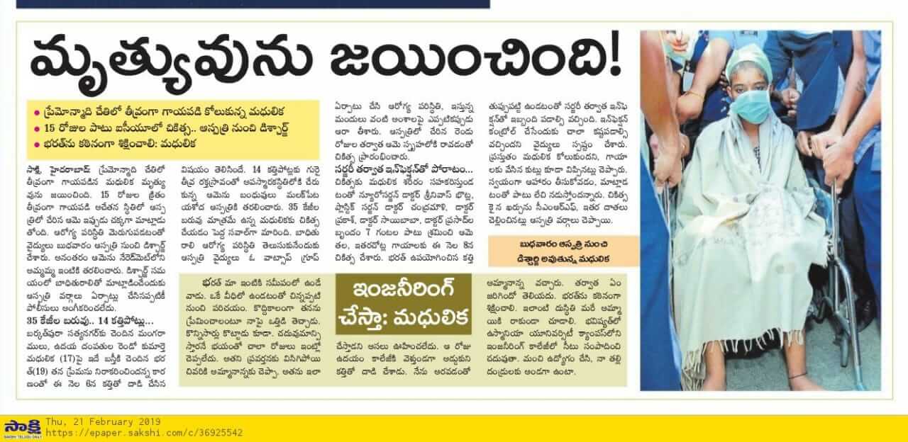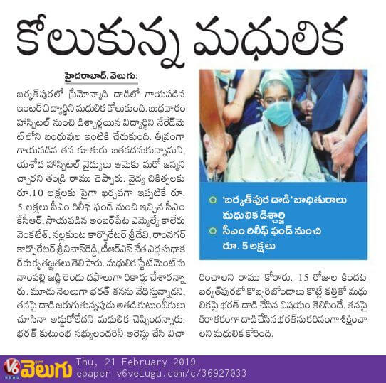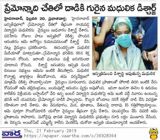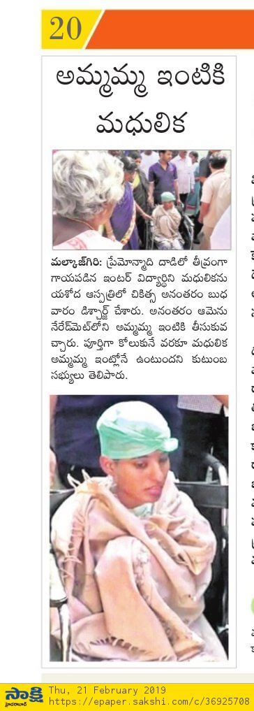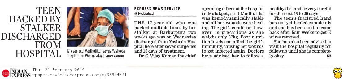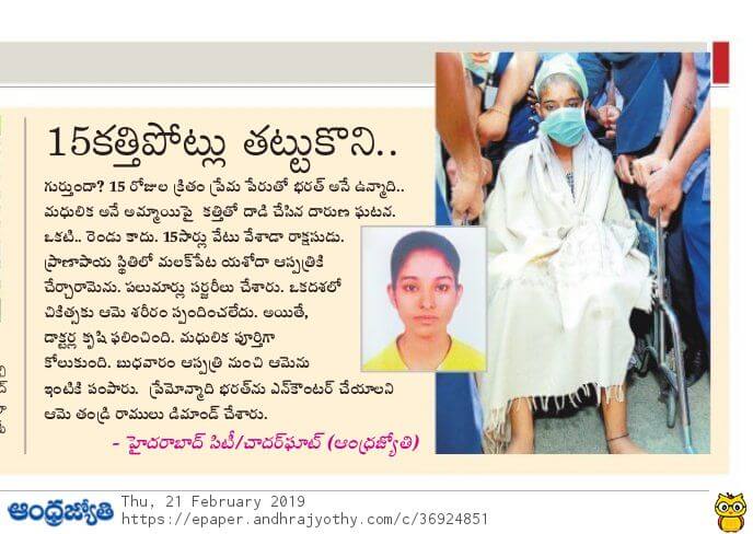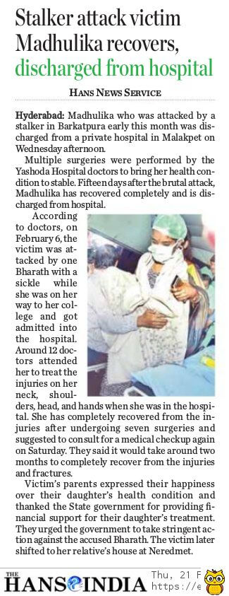 - https://www.thehansindia.com/posts/index/Telangana/2019-02-20/Madhulika-attacked-by-stalker-discharged-from-hospital-after-complete-recovery/498692