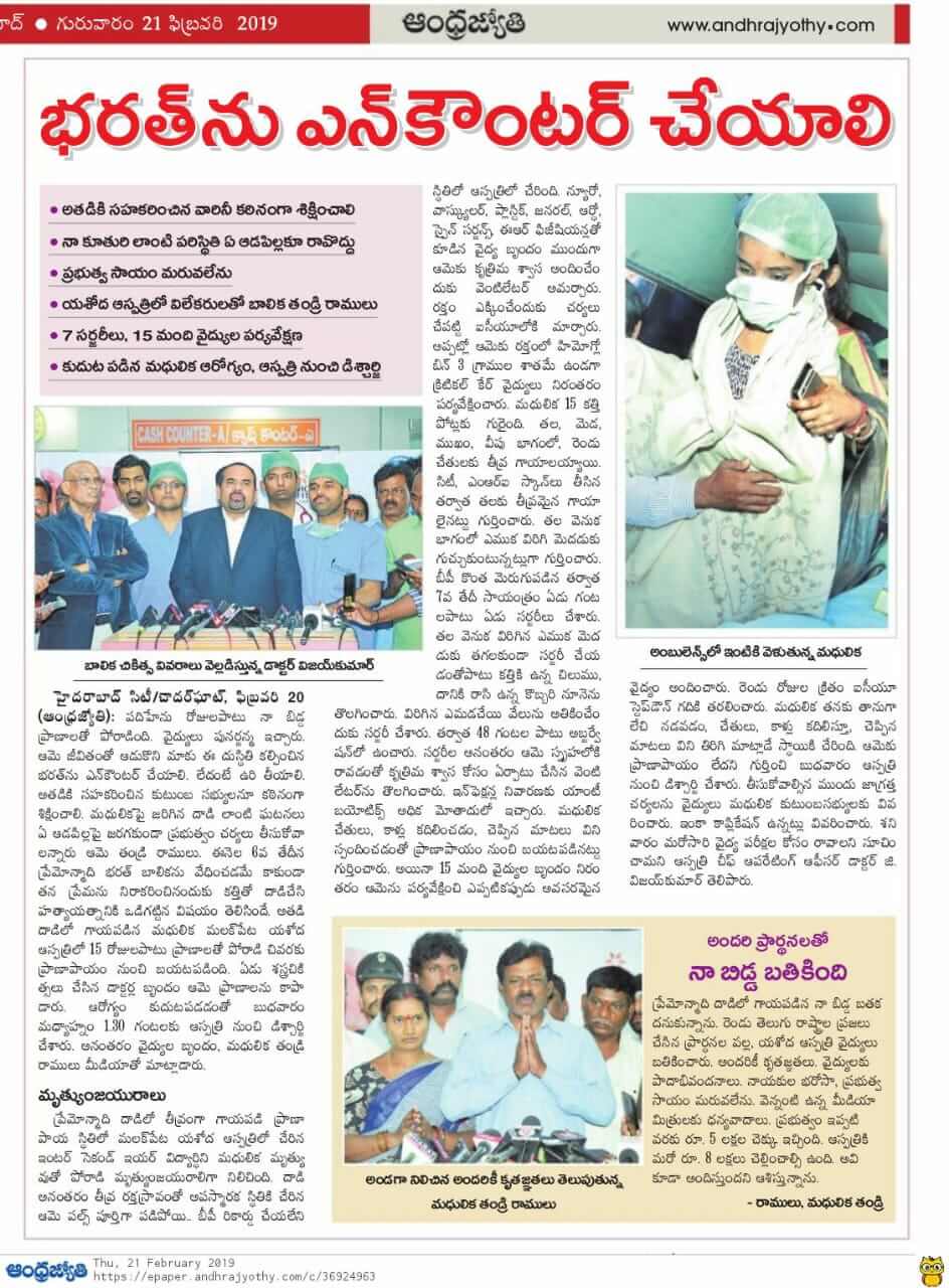 Hyderabad, 20th February, 2019: Madhulika, a 17-year-old minor girl, was hospitalized to Yashoda Super Specialty hospitals, Malakpet after being brutally attacked on February 2, 2019 with a crude weapon. On arrival, the patient was unconscious with non-recordable blood pressure and significant blood loss. She was intubated and supported on ventilation and immediately attended by team of doctors including neurosurgeon, vascular surgeon, plastic surgeon, general surgeon, orthopedic surgeon, spine surgeon, and ER physicians. Blood products transfusion was started and patient was shifted to ICU. Patient was transfused with multiple blood and products as her HB was around 3 gm% and was continuously monitored by critical care team.