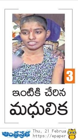 - http://www.teluguwishesh.com/190-andhra-headlines-flash-news/89799-madhulika-attacked-by-stalker-discharged-from-hospital-after-complete-recovery.html