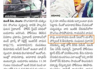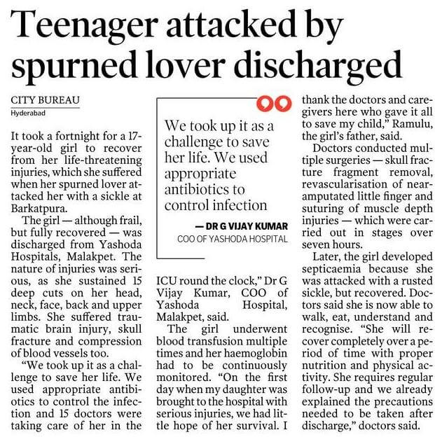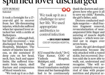 Patient was conscious and was extubated after couple of days. As the weapon used was contaminated, patient had septicemia. Patient was treated with appropriate antibiotics and infection was controlled. “She was kept in ICU under the supervision of 15 doctors, round the clock with regular physiotherapy and proper nutrition.” Dr. G. Vijay Kumar, Chief Operating Officer of Yashoda Hospital, Malakpet explained.