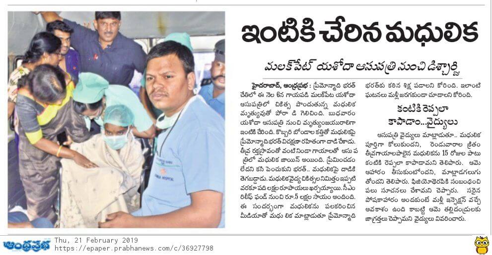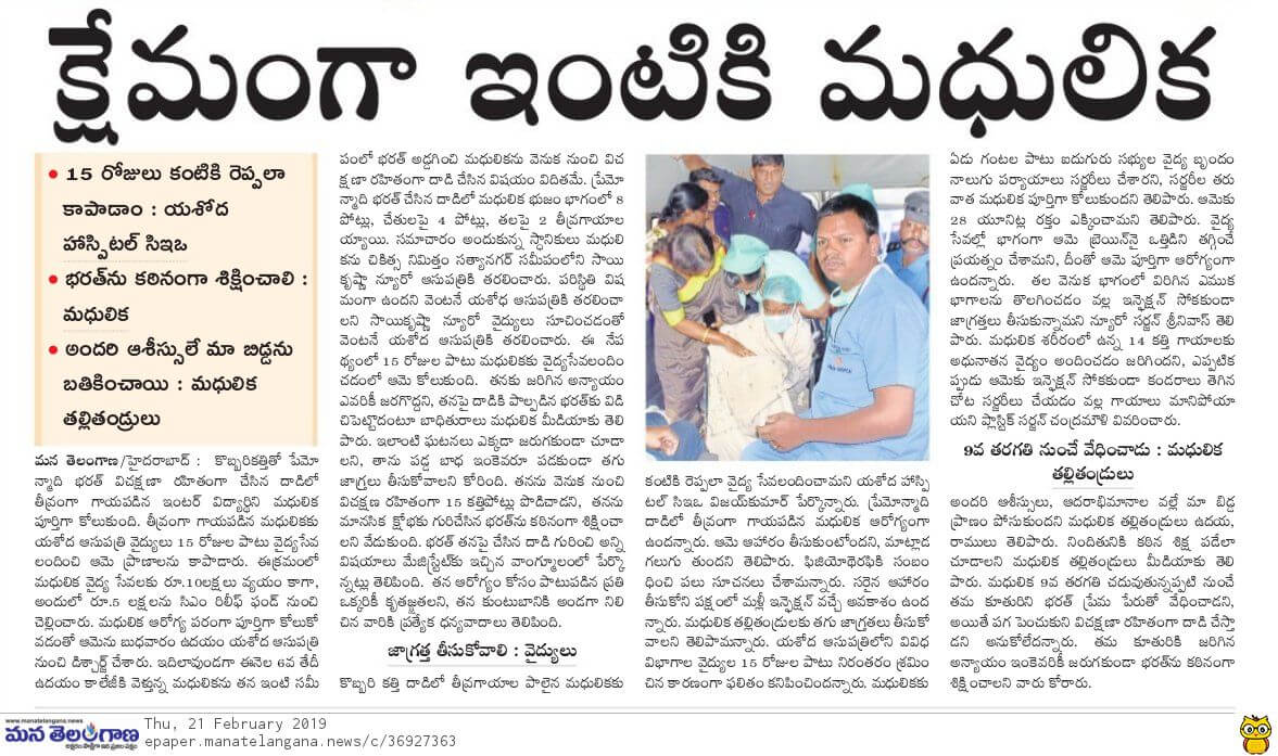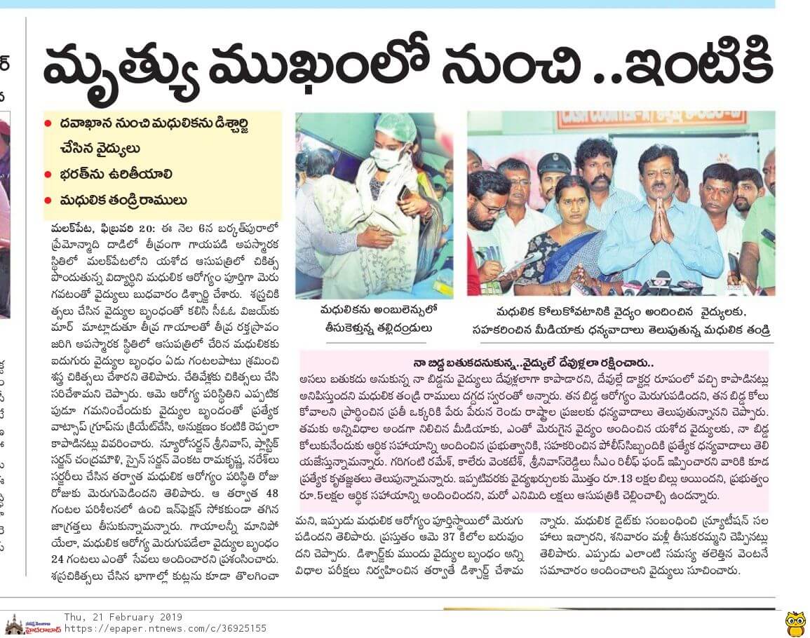 Yashoda Hospitals > News > Madhulika, a 17-year-old minor girl returns home after her struggle for live at Yashoda Hospitals, Malakpet