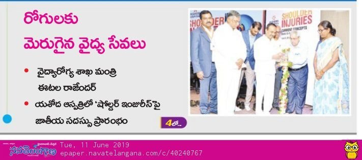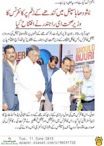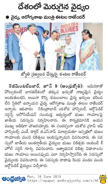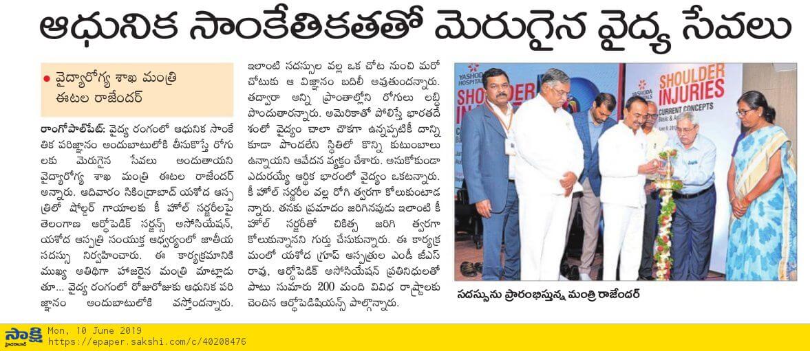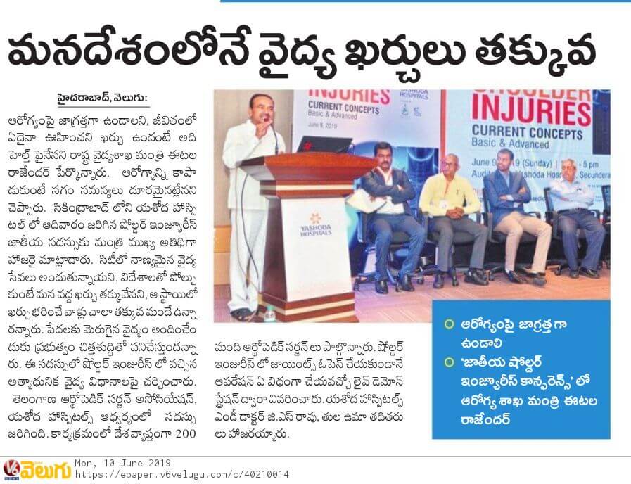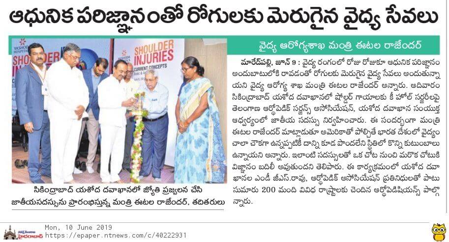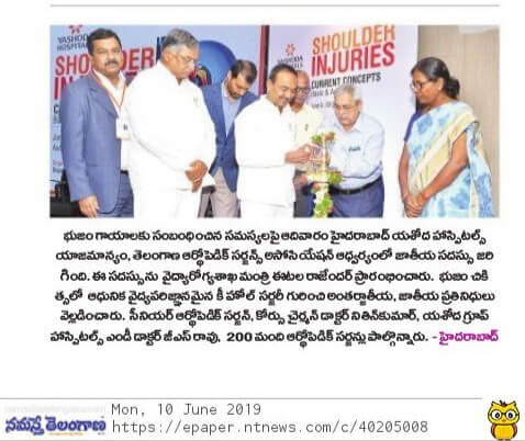 Hyderabad, 9th June 2019: In association with Telangana Orthopedic Surgeons Associations (TOSA), Yashoda Hospitals, Secunderabad conducted the national conference on Shoulder injuries: Current concepts, Basic and advanced. Health Minister Etela Rajender was the chief guest of the conference, which was presided over by the Managing Director of Yashoda Hospitals, Dr. G. S. Rao. The conference was led by Chairman and Senior Orthopedic Surgeon, Dr. Nithin Kumar. The conference was attended by over 200 national and international faculty.
