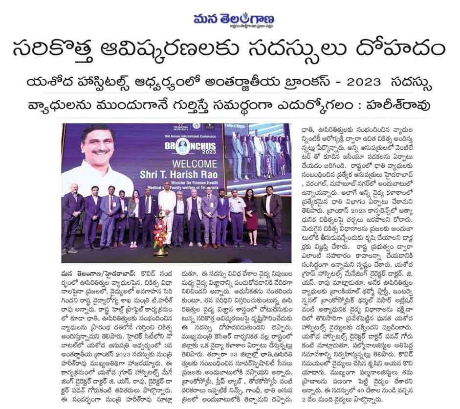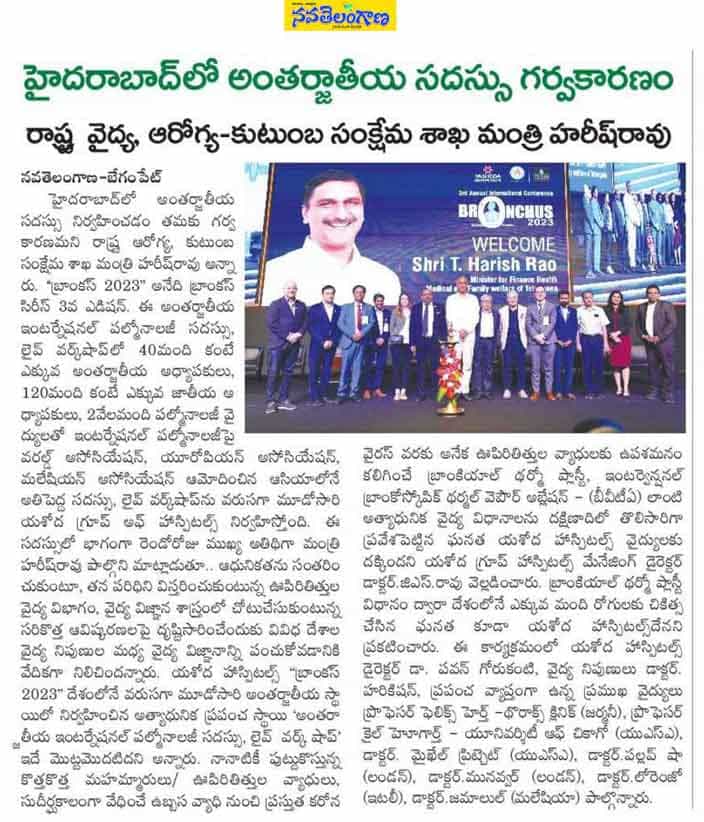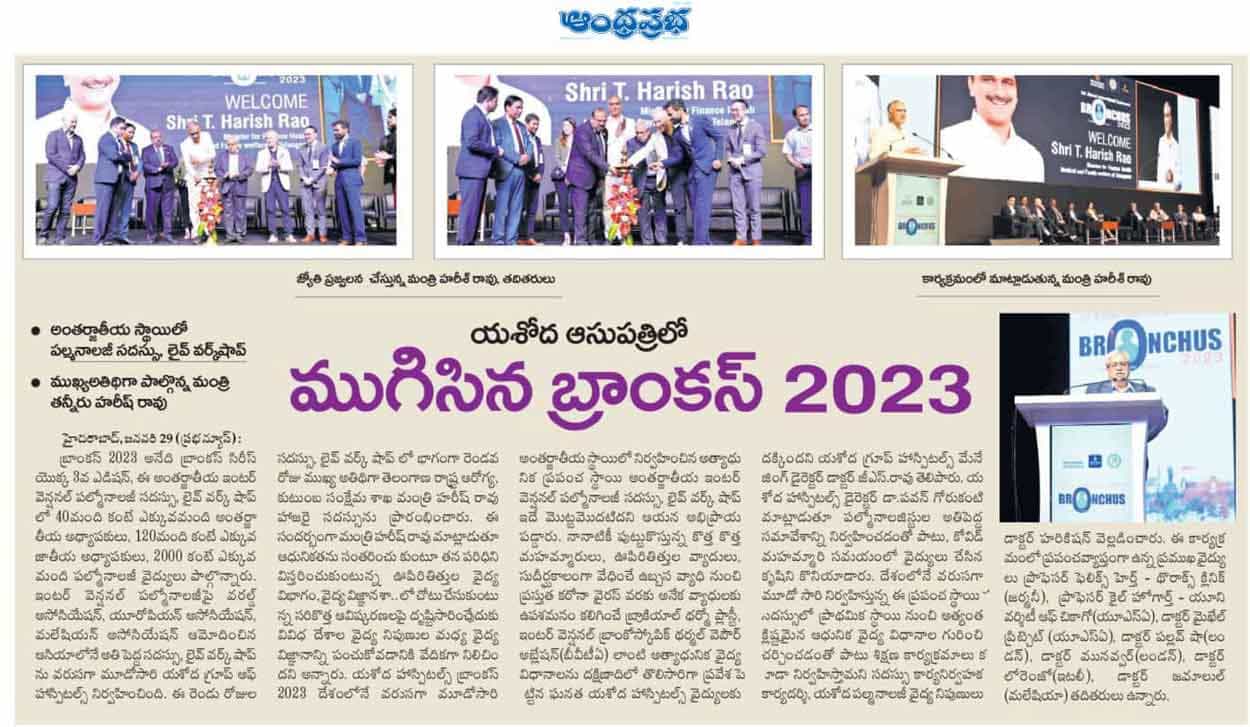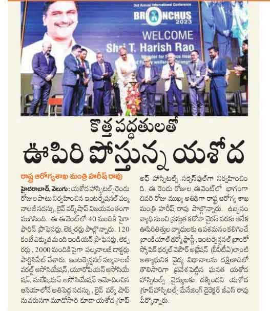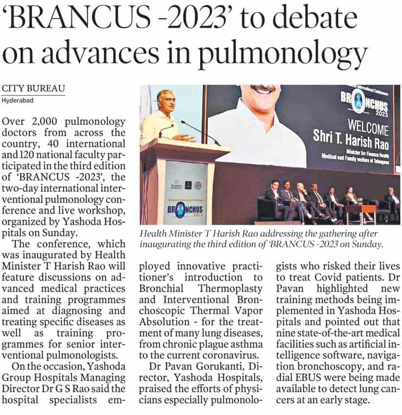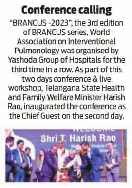 “Yashoda Hospitals’ BRONCHUS 2023 is the first state-of-the-art, world-class International Interventional Pulmonology Conference and Live Workshop organized in the country for the third consecutive time,” said Shri Harish Rao while congratulating the management of Yashoda Hospitals’ management.