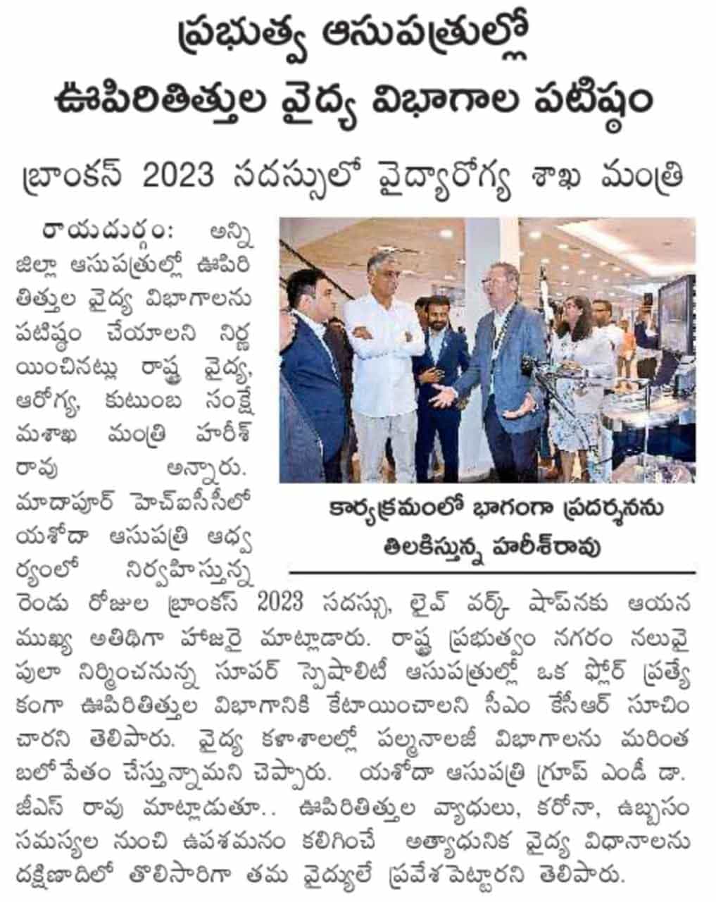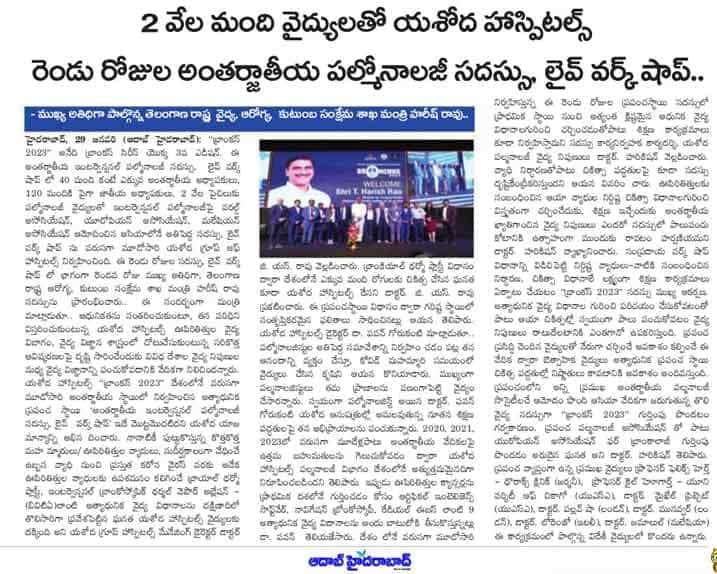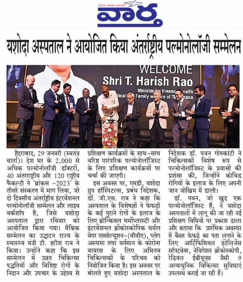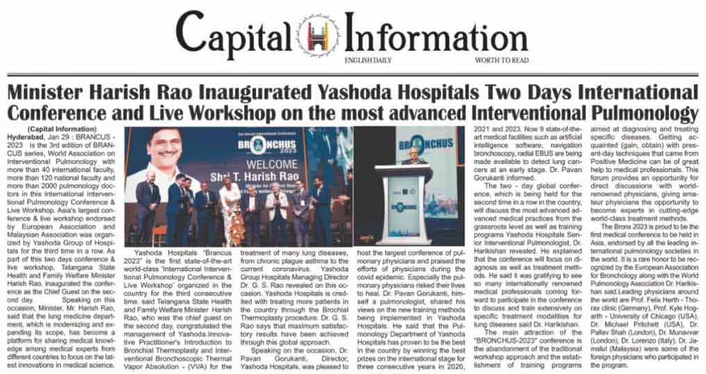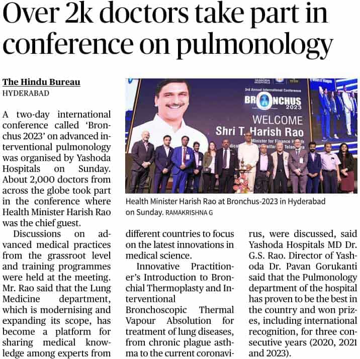 “Yashoda Hospitals’ BRONCHUS 2023 is the first state-of-the-art, world-class International Interventional Pulmonology Conference and Live Workshop organized in the country for the third consecutive time,” said Shri Harish Rao while congratulating the management of Yashoda Hospitals’ management.