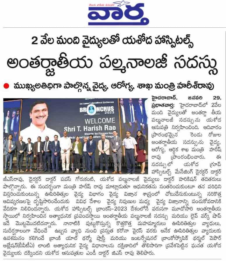 Yashoda Hospitals has successfully organized “BRONCHUS 2023”, the 3rd edition of the Bronchus series of the World Association on Interventional Pulmonology. Over 40 international faculty, 120 national faculty, and 2000 pulmonology doctors attended this International Interventional Pulmonology Conference and Live Workshop. The largest conference and live workshop in Asia, endorsed by the European Association and the Malaysian Association, was organized by the Yashoda Group of Hospitals for the third time in a row. As part of this two-day conference and live workshop, Telangana State Health and Family Welfare Minister Shri Harish Rao inaugurated the conference as the chief guest on the second day.