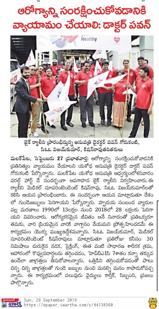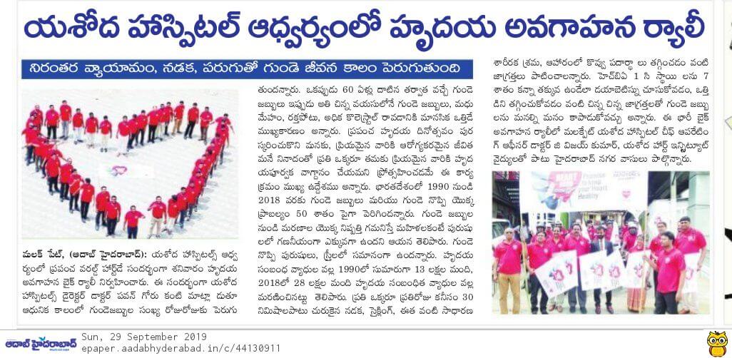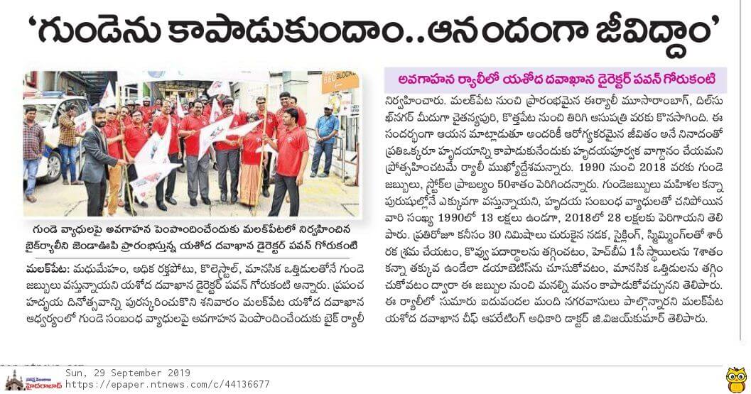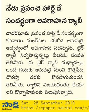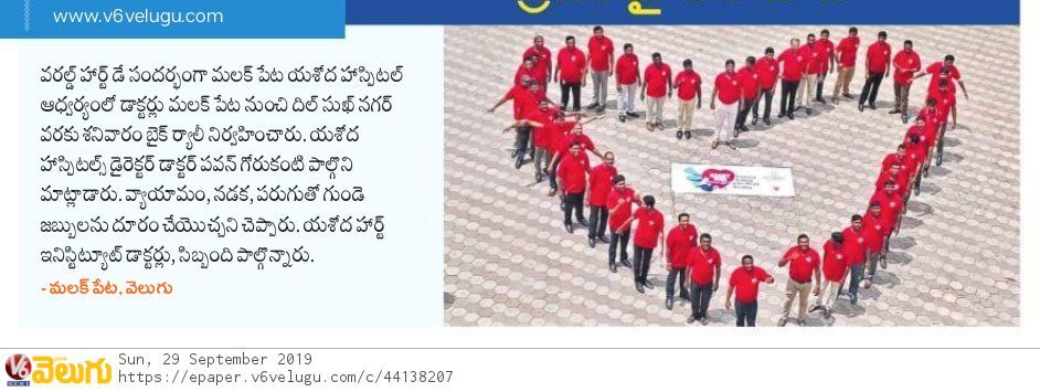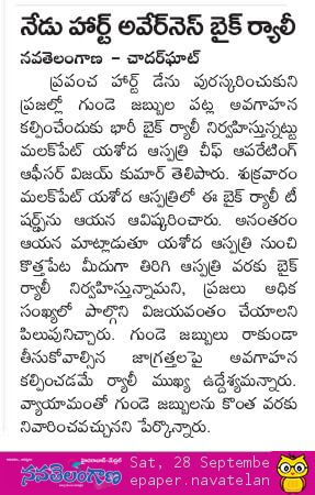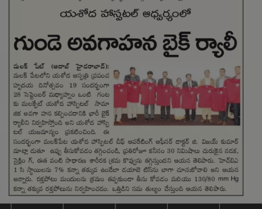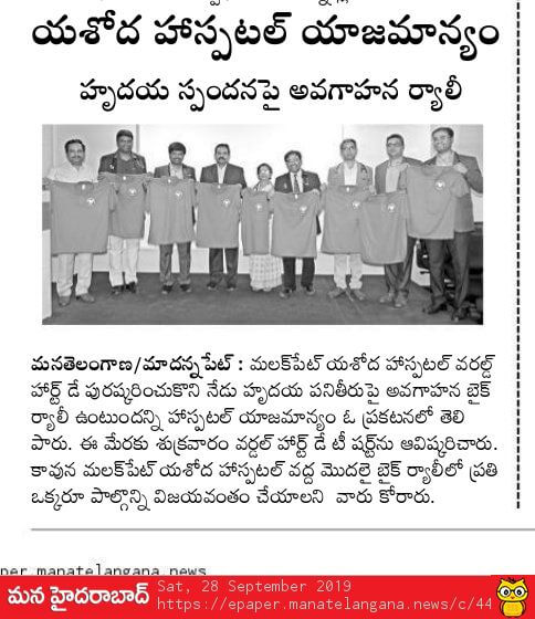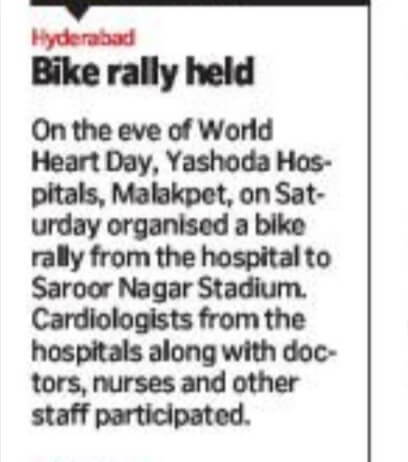 Employees at Yashoda Hospitals, Malakpet enthusiastically participated in a bike rally on the eve of World Heart Day to raise awareness regarding heart health. Doctors, nurses, and other staff from Yashoda Hospitals were involved in the event. The rally began at the hospital and went up to Saroor Nagar Stadium, covering a total distance of 10 km. The participants carried banners that stated their promise of keeping their hearts healthy.
