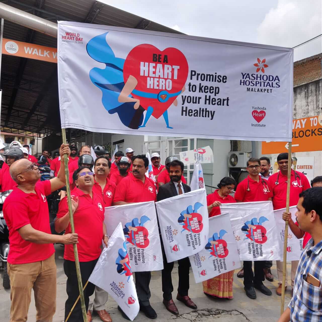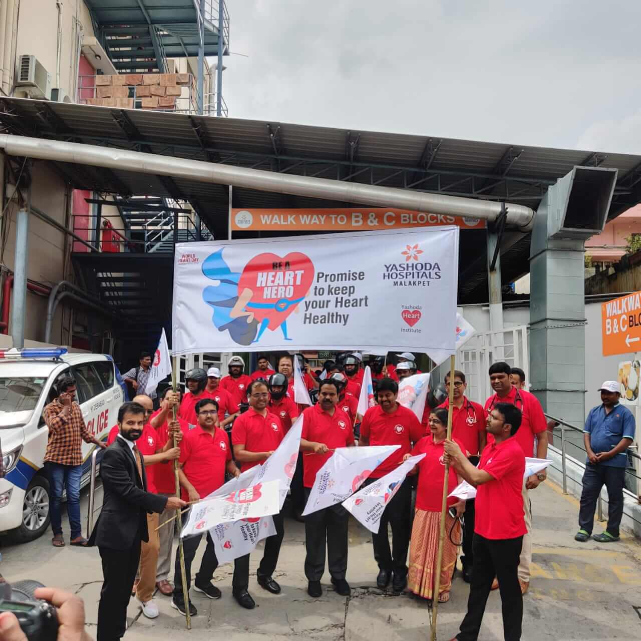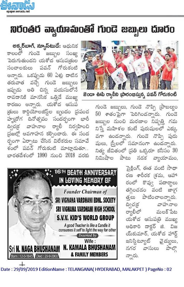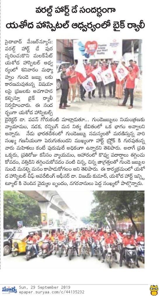 Employees at Yashoda Hospitals, Malakpet enthusiastically participated in a bike rally on the eve of World Heart Day to raise awareness regarding heart health. Doctors, nurses, and other staff from Yashoda Hospitals were involved in the event. The rally began at the hospital and went up to Saroor Nagar Stadium, covering a total distance of 10 km. The participants carried banners that stated their promise of keeping their hearts healthy.