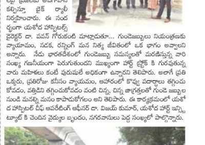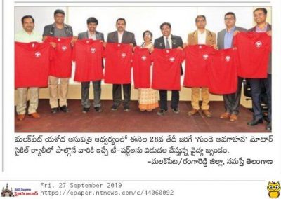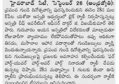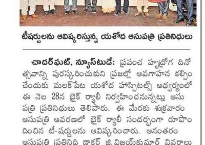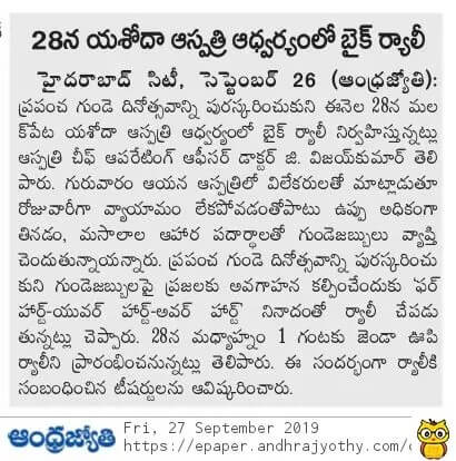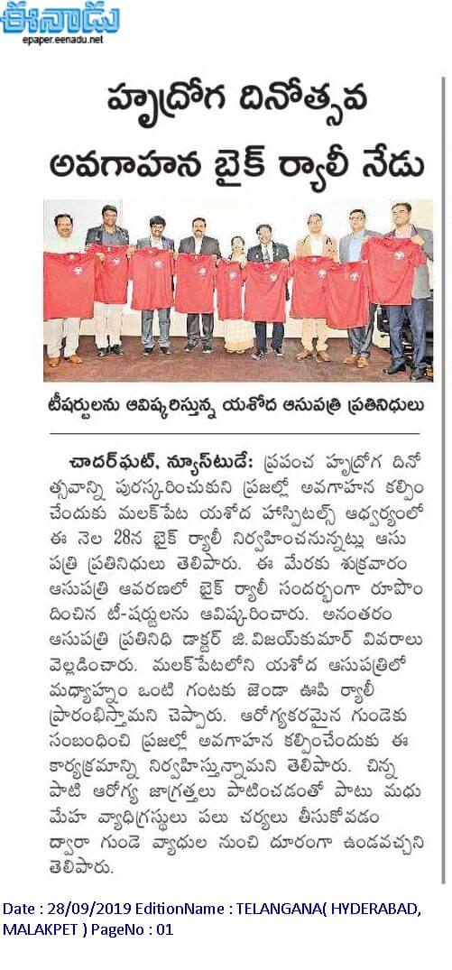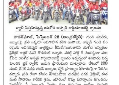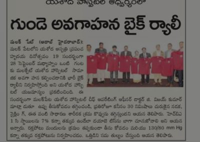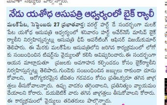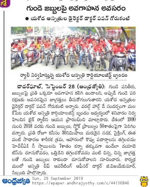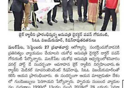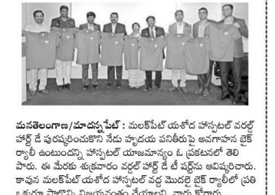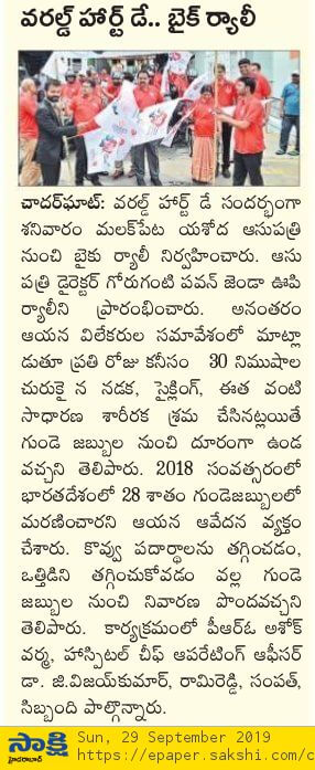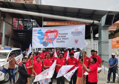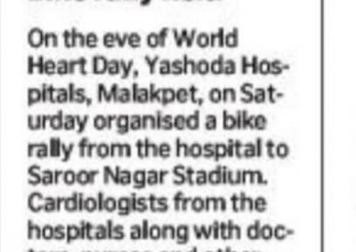 Employees at Yashoda Hospitals, Malakpet enthusiastically participated in a bike rally on the eve of World Heart Day to raise awareness regarding heart health. Doctors, nurses, and other staff from Yashoda Hospitals were involved in the event. The rally began at the hospital and went up to Saroor Nagar Stadium, covering a total distance of 10 km. The participants carried banners that stated their promise of keeping their hearts healthy.