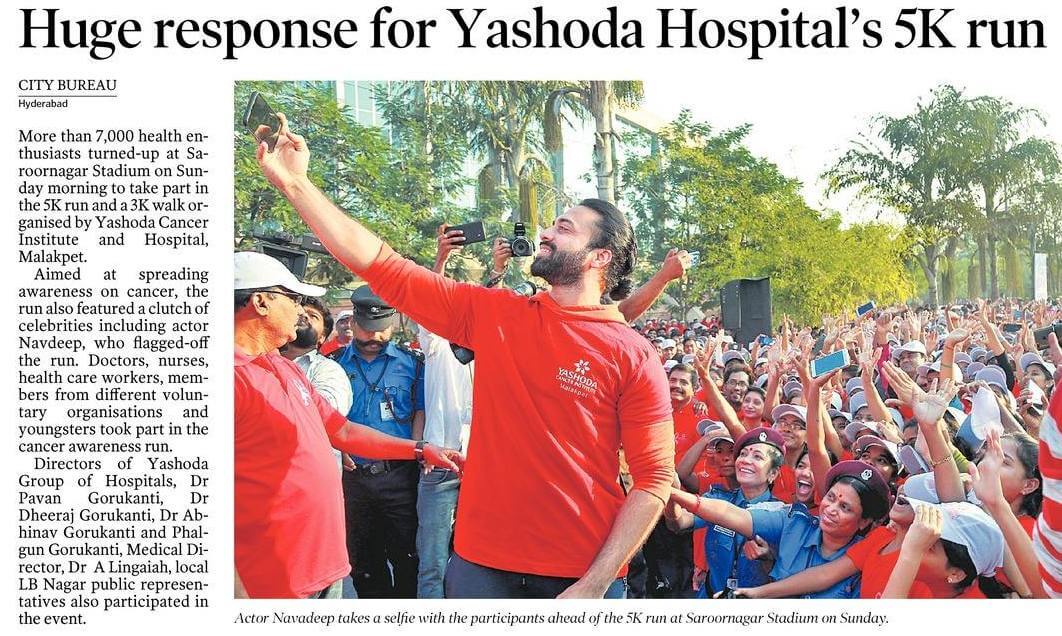 The run featured Telugu film star Navdeep, who flagged-off the bike rally and 5K run. Speaking on the occasion Mr. Navdeep congratulated Yashoda Hospitals for taking this initiative to create awareness among the public to fight against deadly cancer. Mr. Navdeep took it a step ahead and posted his selfie on Instagram to spread the word online.