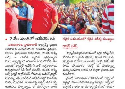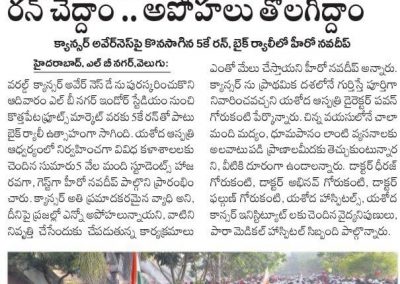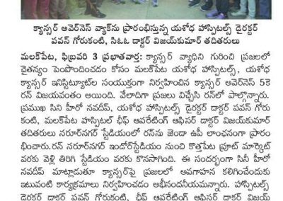 Also present during the run was Dr. Vijay Kumar, Chief Operating Officer of Yashoda Hospitals, Malakpet and Dr. G. V. K. Reddy, Consultant, Medical Oncology, Yashoda Hospitals, Malakpet. He said, “Cancer is causing more panic than all the diseases in India. Telangana and Andhra Pradesh states in particular have a high burden. Early detection is the key factor in fighting and surviving with cancer. We are hosting this awareness walk to fill the gap between knowledge and discussion surrounding this killer disease.”