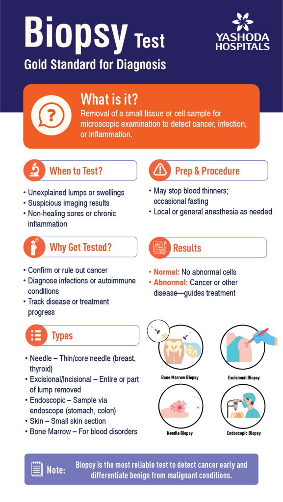 The biopsy includes a histopathological examination of the samples to look for changes at the cellular levels. Most commonly, a biopsy is performed for differentiation between cancerous and non-cancerous cells. While imaging techniques can identify the area of concern, biopsy testing is a GOLD standard to confirm the diagnosis and take appropriate measures accordingly.