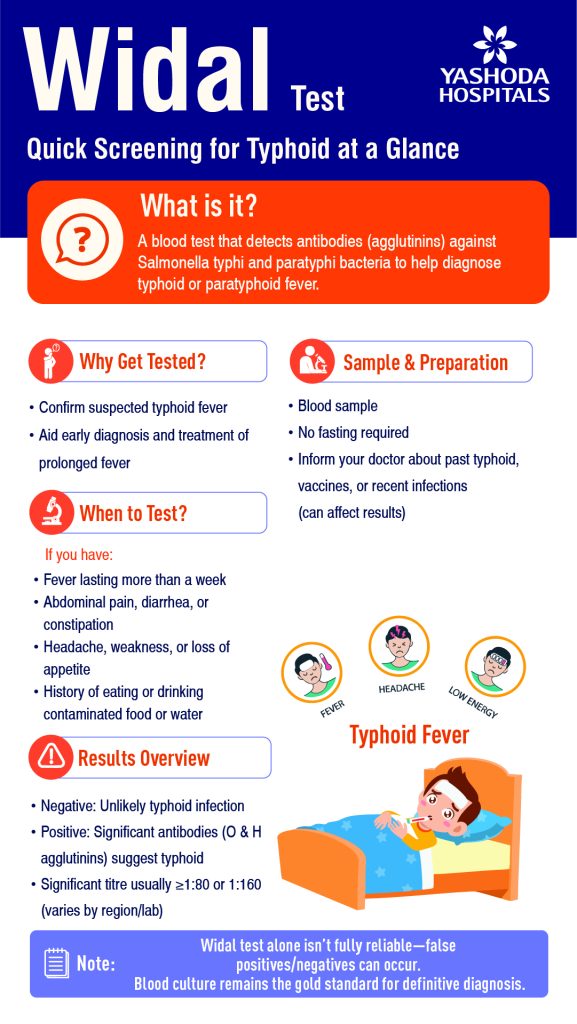The Widal test is a rapid diagnostic test used to identify the presence of infection with “Salmonella typhi” or “Salmonella paratyphi” bacteria. The test is based on the observation that typhoid patients have antibodies against Salmonella typhi in their blood, and therefore the bacteria will agglutinate when mixed with red blood cells from a healthy person. The presence of antibodies in the patient’s blood indicates that they are infected with Salmonella typhi and are likely to have typhoid fever. This test has no significant side effects and provides accurate test results most of the time at an affordable price.